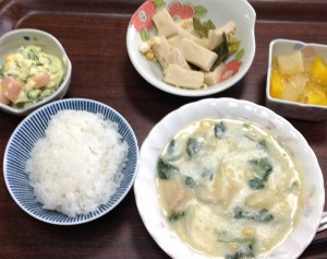 ごはん、みそ汁、豚肉の照り焼き、サラダ、ほうれん草のお浸し、りんご